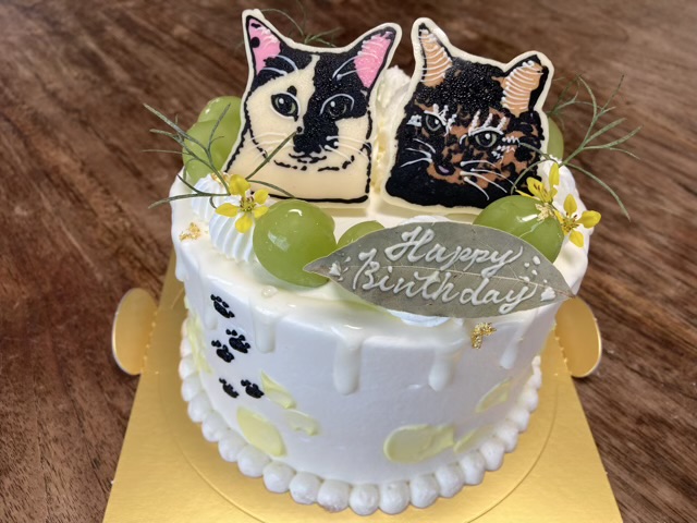 誕生日にお祝いするという歳でもないのですが、夫婦の誕生祝いにに娘がケーキを買ってきてくれました。それもお高いオーダーメイドのケーキ。いそ爺夫婦の顔では様にならないので、飼い猫(元のら猫)であるマロとクロの顔をオーダーしたとのことでした…。