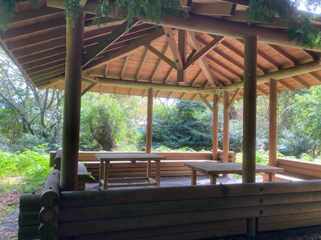 基本尾根沿いに登っていきます。最初は針葉樹の林ですが、標高580m付近の東屋の手前から広葉林も現れます。今日はここでは休まず素通りです。