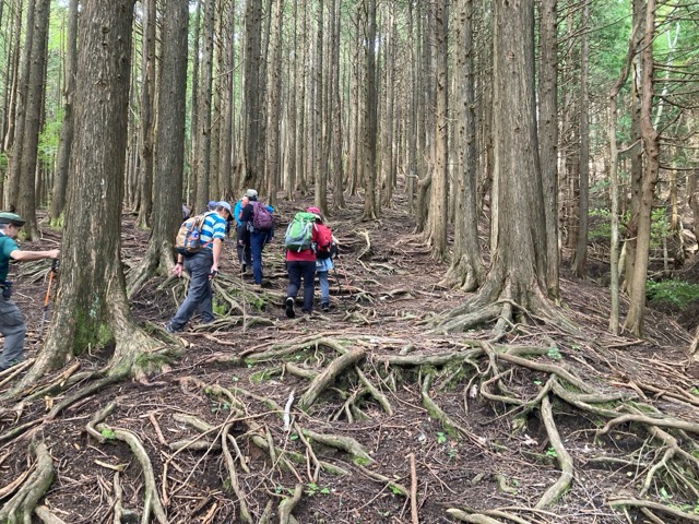 東屋を過ぎると木の根が張った針葉樹の林が続きます。下草がないので、どこでも歩けてしまいます。