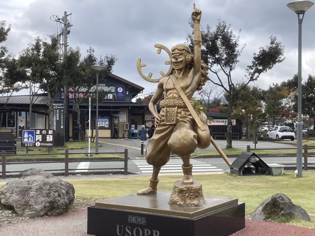 ウソップ像は、阿蘇駅前にあり、道の駅 阿蘇の駐車場に停めることができます。駅前なのですぐわかります。