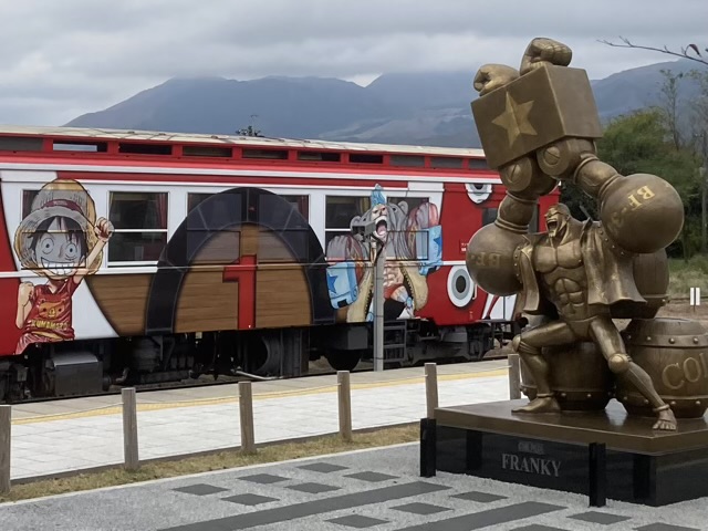 フランキー像は、おしゃれな高森駅前にあり、駅前の駐車場に停めることができます。サニー号トレインも見ることができました。駅の中には、復興応援メッセージが飾られています。