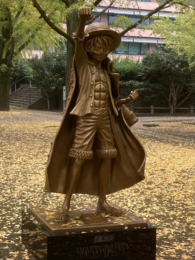 そして、県庁前のルフィ像にやってきました。熊本県庁南側駐車場に停めると、道路を渡ってすぐの場所です。銀杏並木の中にあります。