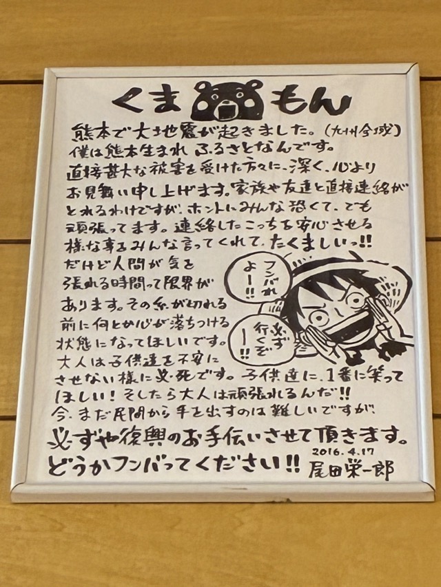 熊本生まれの尾田先生の熊本復興メッセージがありました。熊本城を見ると被害の大きさがわかりますが、さらなる復興に向け少しでも応援できればと思います。