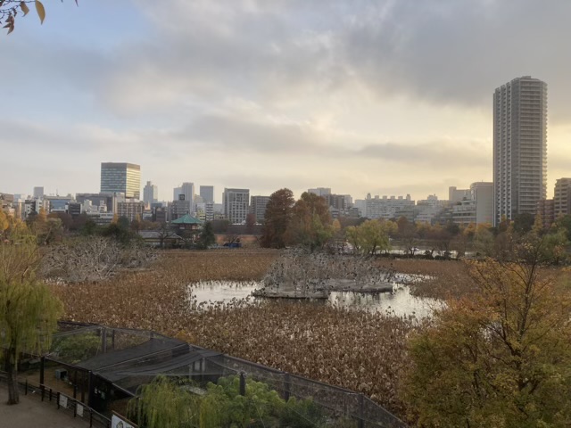 12月になると日暮れは早いですね。不忍池も寒々しいです。